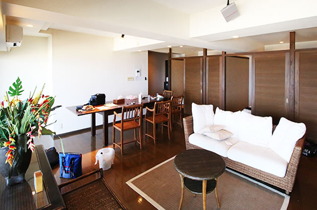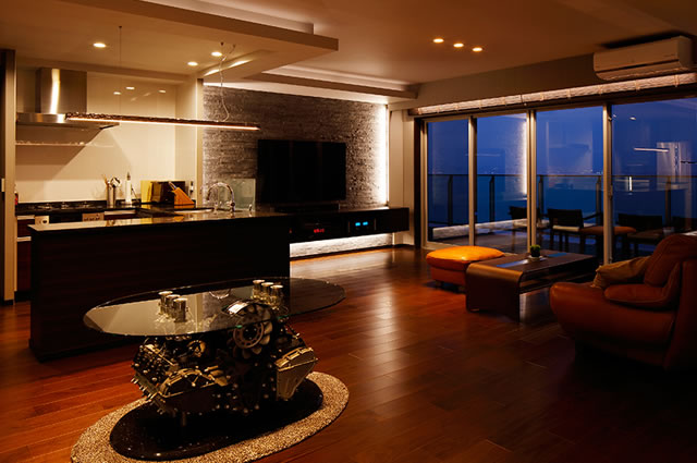 88㎡のマンションが、ワンランク上の上質な空間に生まれ変わったトータルリノベーション。 マンションにありがちな長い中廊下、細かく仕切られた間取りを全面的に見直し、4LDKから2LDKに間取り変更。配管ルートを工夫することで、床高を変えずにキッチンの移動、浴室のサイズアップを行っています。 和室、洋室、廊下を一つにまとめた30畳のLDKは、広々としたルーフバルコニーとの相乗効果で、マンション最上階ならではの極上空間に。 奥様、旦那様それぞれの書斎コーナーをはじめ、空間を彩る製作家具を随所に配置しています。